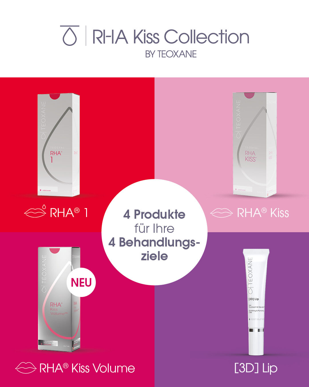 Teoxane bietet einzigartige Lippenbehandlungen, wobei die RHA Kiss Collection⁵⁻⁷ speziell dafür entwickelt wurde, harmonische, natürlich wirkende Ergebnisse zu erzielen, die sich mit Ihren Gesichtsausdrücken mitbewegen⁴.